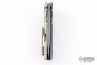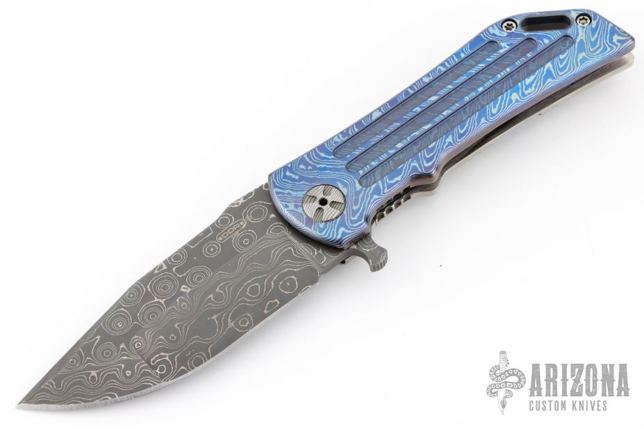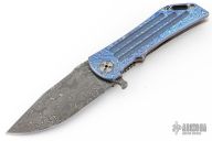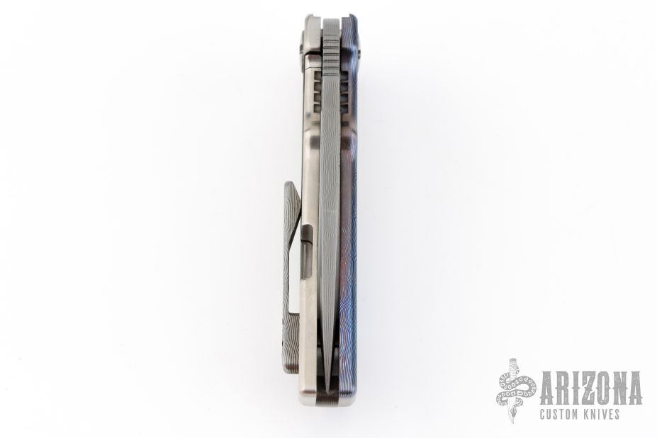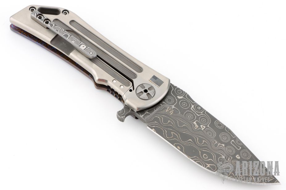 This Dominator V4 by Darrel Ralph features a Damascus clip point blade with notched thumbrest and flipper. The handle has a MokuTi and satin finished titanium frame with Damascus backspacer and tip up clip. Rides on bearings, nice detent, lockup and blade seating. Has stainless lockface insert. Excellent Condition.