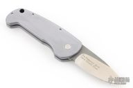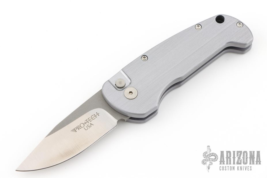 This Sidekick by Protech knives features a satin finish clip point blade with grey aluminum handle, stainless release button and clip positioned for tip up carry. Comes with original box. Marked Pre-Production. Excellent condition. Very early piece. Comes with original box.