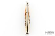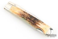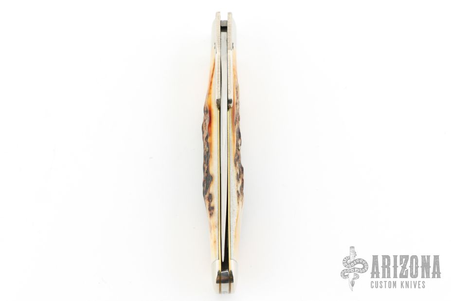 This swing guard lock back by Robeson features a mirror finished blade with nail nick. The handle has nickel silver bolsters/guard, stag scales, brass liners, stainless steel spring. Comes with original box. Excellent condition.