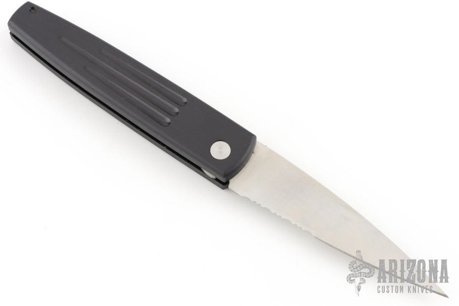 This Spike automatic by Benchmade Knives features a satin finished partially serrated blade and black anodized aluminum frame. Comes with original box and papers. Excellent condition.