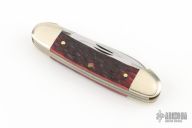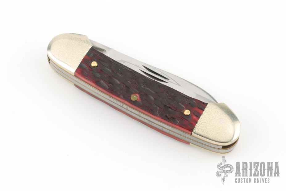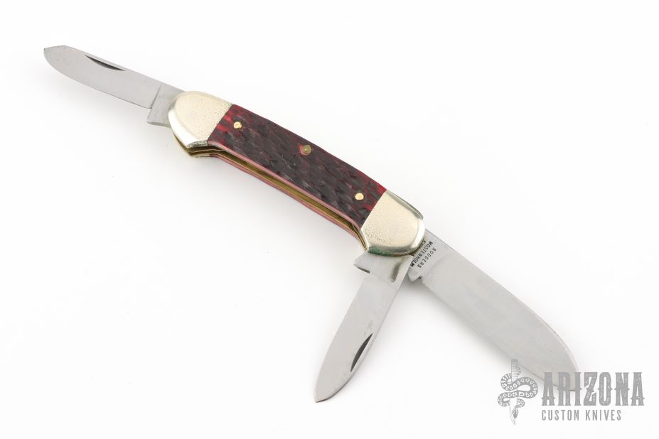 This Canoe Slipjoint by Parker and George Wostenholm features satin finished blades with nail nicks. The handle has nickel silver bolsters, jigged bone covers, brass pins and liners, steel springs. Has some scuffs, scratches and patina. Great condition for its age, and otherwise.