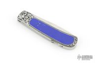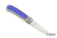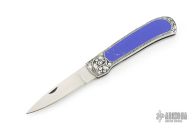 This interframe lockback by Judy Gottage features a hand rub satin finished blade with nail nick, it is marked "Judy Gottage" on the blade. The handle has an engraved stainless steel frame, Lapis inlays, and a stainless steel backspacer. The handle has no exposed hardware. Has some light scratches otherwise excellent condition. Judy's knives don't come up for sale very often.