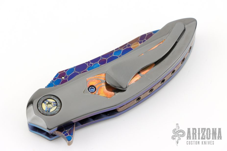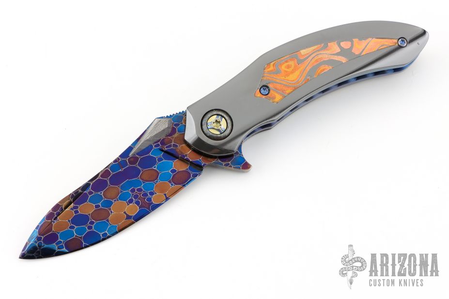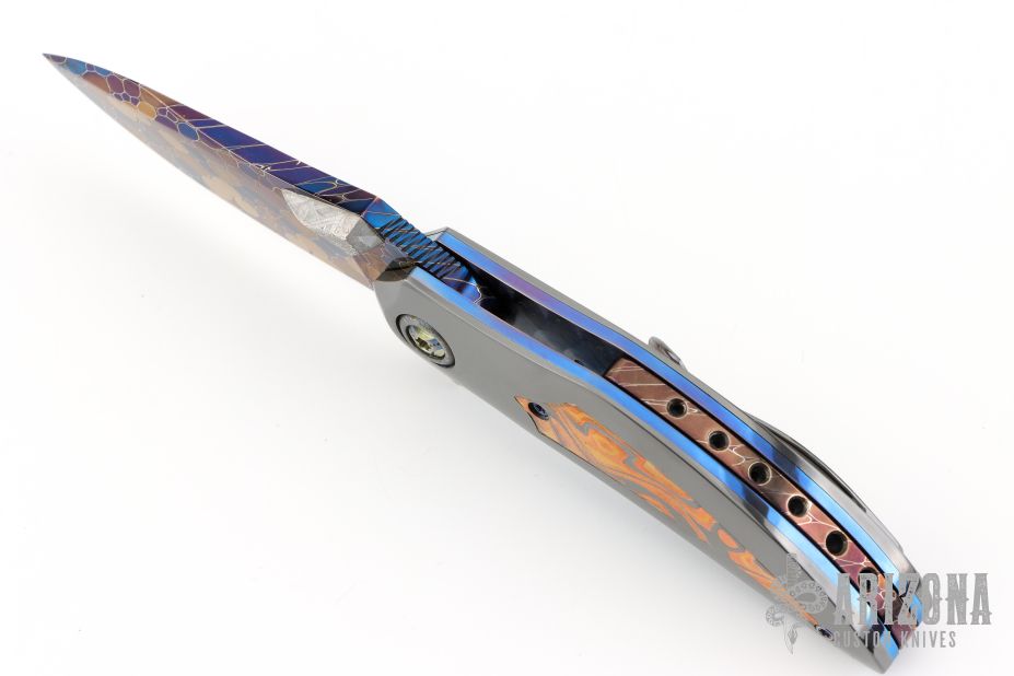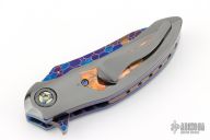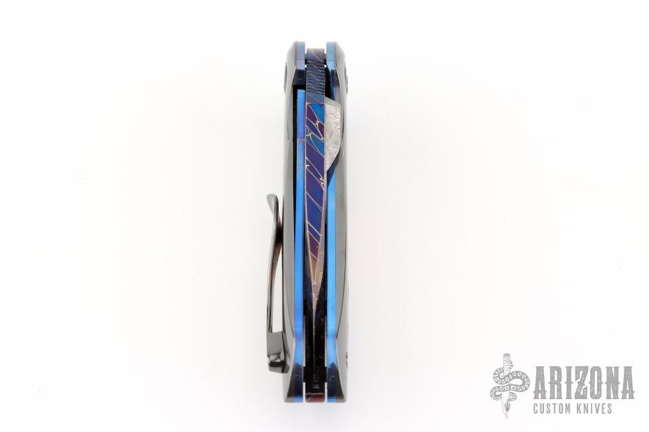 This QSB by Peter Martin features a Dragonskin Damascus blade with a single meteorite thumbstud and a fileworked thumbrest.  The handle has zirconium scales with mokume inlays over anodized titanium liners.  Damascus floating backspacer.  Zirconium tip up pocket clip. Hidden screws.  Nice Detent, lockup and blade seating. Has a small scratch/ding on the handle otherwise the knife is in excellent condition.
