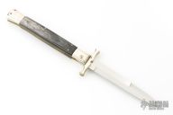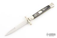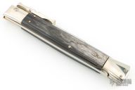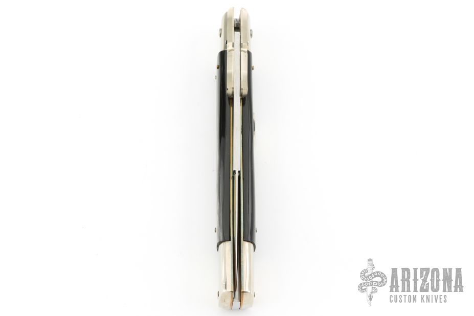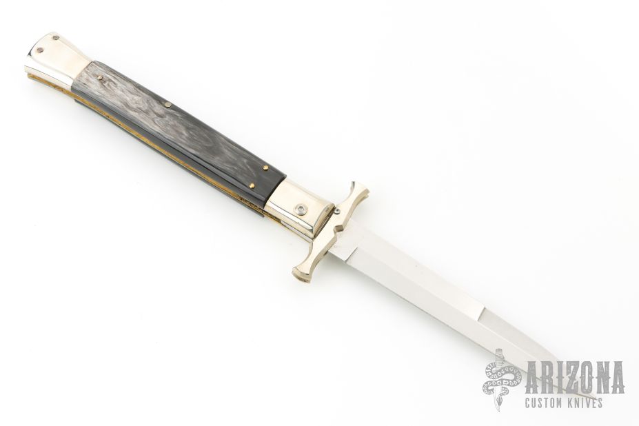 This 13" Batwing Swinguard Auto from A.G.A. Campolin has a mirror polished stainless steel spear point blade with false top edge. Handle has buffalo horn scales with mirror polished nickel silver bolsters and pommel, brass liners, brass pins, stainless steel backspacer. Has a few light scratches, otherwise excellent condition.
