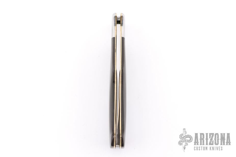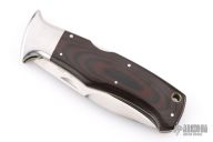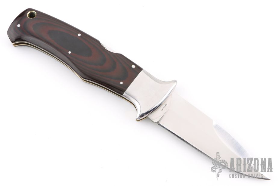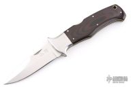 This 1980's Al Mar SERE features a satin finished spear point blade with a false top edge. The handle has satin finished stainless steel bolsters, brass liners, black/brown paper micarta scales, and a stainless steel backspacer. This is a nice heavy-duty folder. Has some light scratches, otherwise excellent condition.
