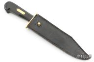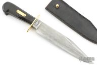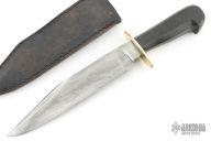 This Bill Bagwell scarce one-of-a-kind heavy-duty Camp Damascus Bowie with sharpened top edge, .387" blade stock and 1.566" blade depth, hidden tang construction. The handl has a brass guard, crow's beak carved ebony handle with a brass pinned escutcheon. Comes with a black leather sheath. Excellent condition.