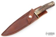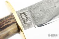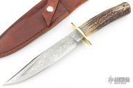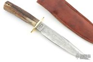 Has a Damascus blade with sharpened top edge, .348" blade stock and 1.374" blade depth, hidden tang construction. The handle has a brass guard and stag grip with black/brass spacers and a lanyard hole. Comes with original brown leather sheath. Excellent condition.