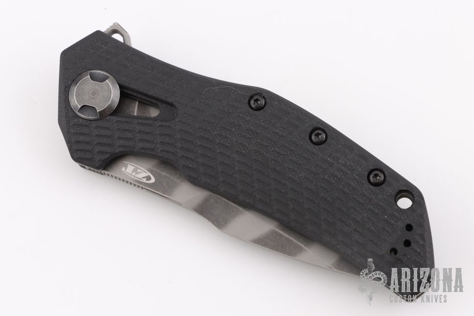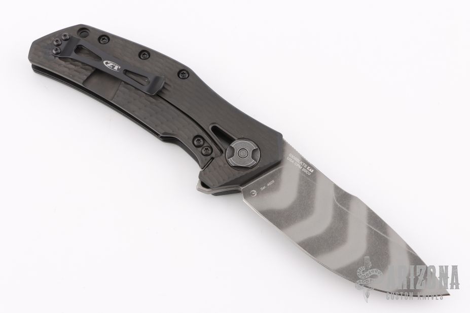 The ZT 0308BKLTS is a beefy tactical folder with everything you'd expect from a ZT going for it. It's made of a black G-10 handle with a titanium frame lock, and DLC coating. The blade is made of CPM-20CV steel with black oxide BlackWash, and is finished with tiger stripes. The handle has texture that provides a sure grip, but won't chew up your hand or your pocket. The profile of the handle and blade facilitate comfortable ergonomics and safe hard use. s/n 3538. Comes with original box and papers. Excellent condition.