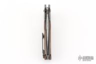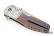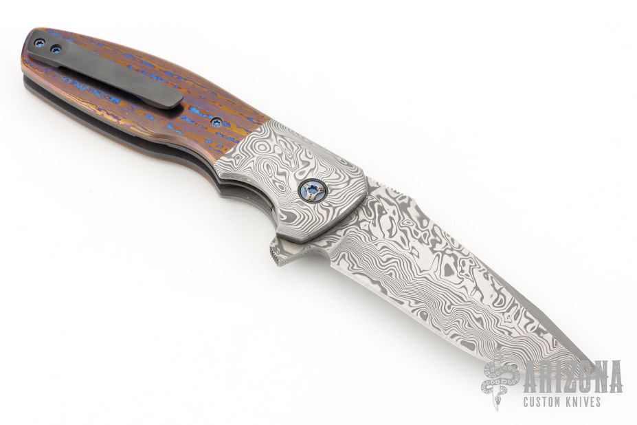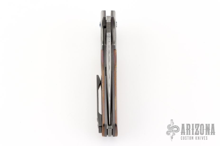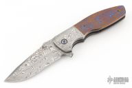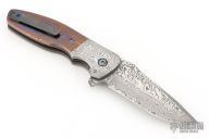 This RAINE Flipper by Kirby Lambert features a Damasteel blade with notched thumbrest and flipper. The handle has Damasteel bolsters with zirconium pivot collars, mokuti scales, bead blasted titanium liners, Damascus backspacer, Zirconium tip up clip. Nice detent, lock up and blade seating.  Excellent Condition.