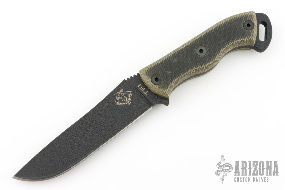 This knife by Ontario Knife Company features a black coated blade and green canvas micarta scales. .254" blade thickness and 1.368" blade depth. Notched thumbrest. Full tang construction. Comes with black nylon sheath. Excellent condition.