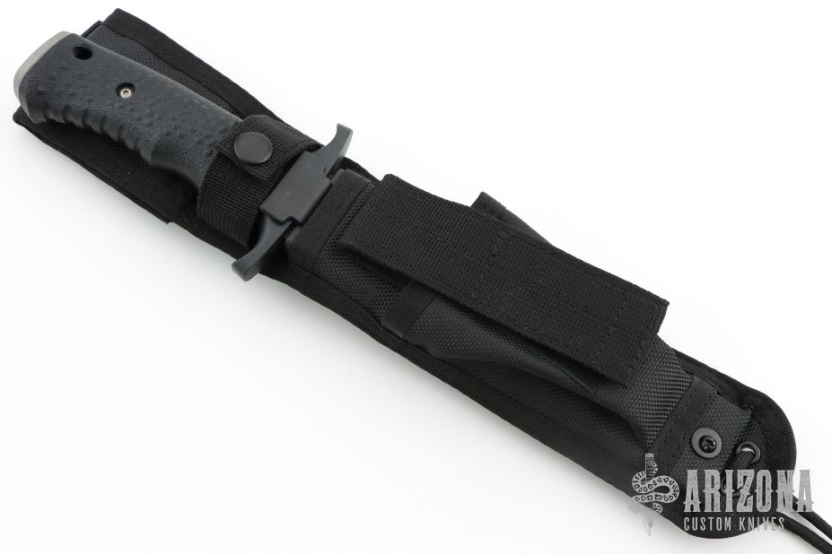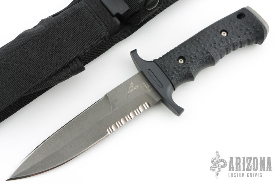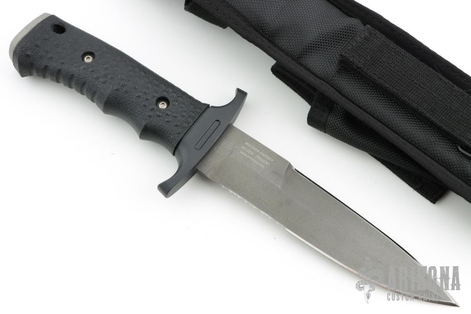 "The Silver Trident is more than a symbol of America's top Special Ops personnel. It's living proof that guys who handle our nation's nastier chores will go through whatever kind of hell is necessary, so long as they have the best gear. The Silver Trident has the most technically advanced handle ever engineered on a combat knife. It's resistant to heat, UV light and chemicals. The brainchild of William Harsey, Jr. and Chief Watson - a founding member of Navy Seal Team 2 - the handle is a co-mold of two versions of the material called Hytrel. Inside, there's a rock-hard version for strength. Outside, there's the soft, textured version for extreme grip control. Use the stainless steel pommel as a hammer. The double-edged clip point blade is 154C stainless steel, heat-treated to achieve a hardness rating of HRC 59-61. That means you get excellent edge retention, strength and flexibility. The non-reflective black blade limits glare and corrosion." Black coated partially serrated double edged blade. 1/4" blade stock and 1 1/4" blade depth, hidden tang construction. Handle is black composite with stainless steel butt cap.