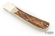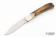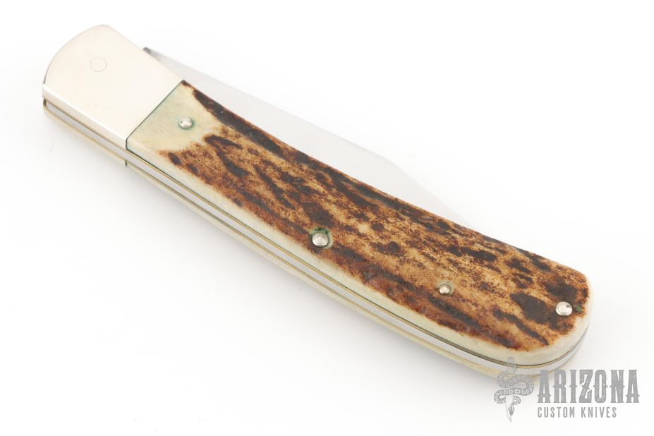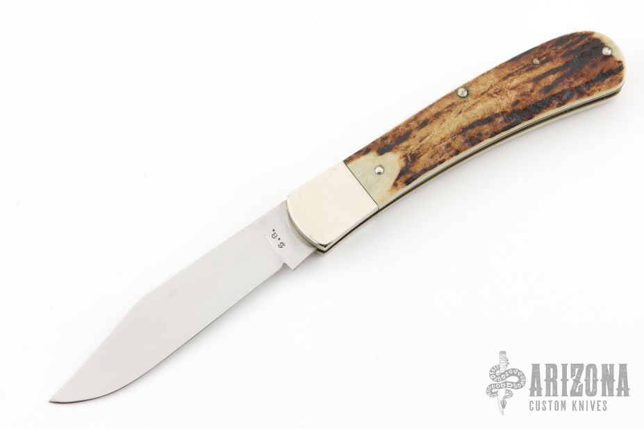 This Bolster Release auto by Neal features a mirror polished blade stamped "S.B.". The handle has nickel silver bolsters, stag scales, brass liners and a stainless steel backspacer. Nice action and lockup. Has a few light scratches, otherwise excellent condition. This is an early auto from Bob, back in the day, when the switch blade laws were questionable, he did not mark his name on the blades.