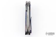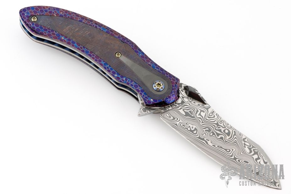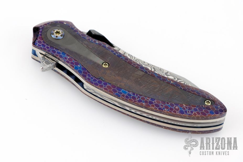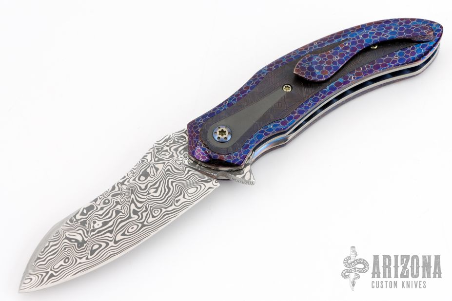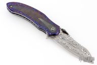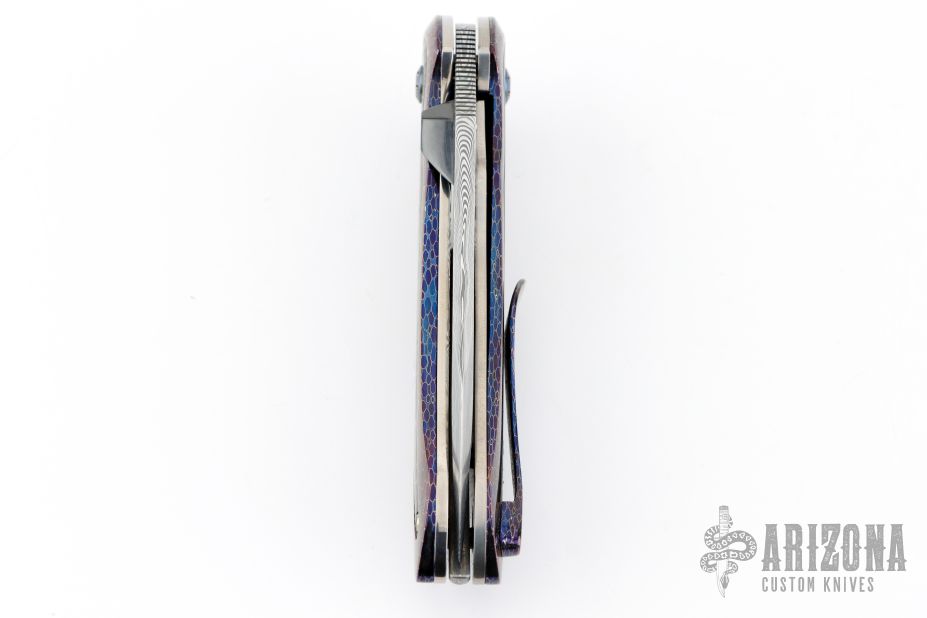 This Left Handed QSB by Peter Martin features a Damasteel blade with zirconium thumb lug and a flipper. The handle has Bertie Rietveld Dragon Skin Damascus scales with meteorite inlays, teardrop shaped zirconium pivot collars, polished and jeweled titanium liners, Damasteel backspacer, and a tip up Dragon Skin Damascus clip with hidden screws, anodized titanium screws and pivot. Rides on bearings, nice detent, lockup and blade seating. Excellent condition.
