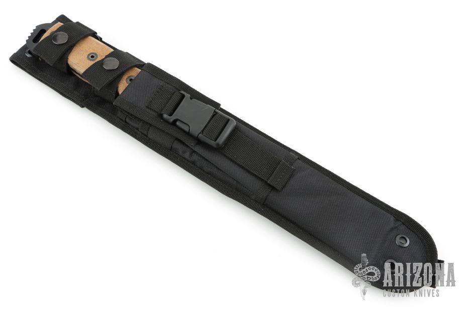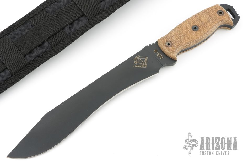 This knife by Ontario Knife Company features a black coated blade and brown canvas micarta scales. .258" blade thickness and 1.664" blade depth. Notched thumbrest. Full tang construction. Comes with black nylon sheath. Excellent condition.