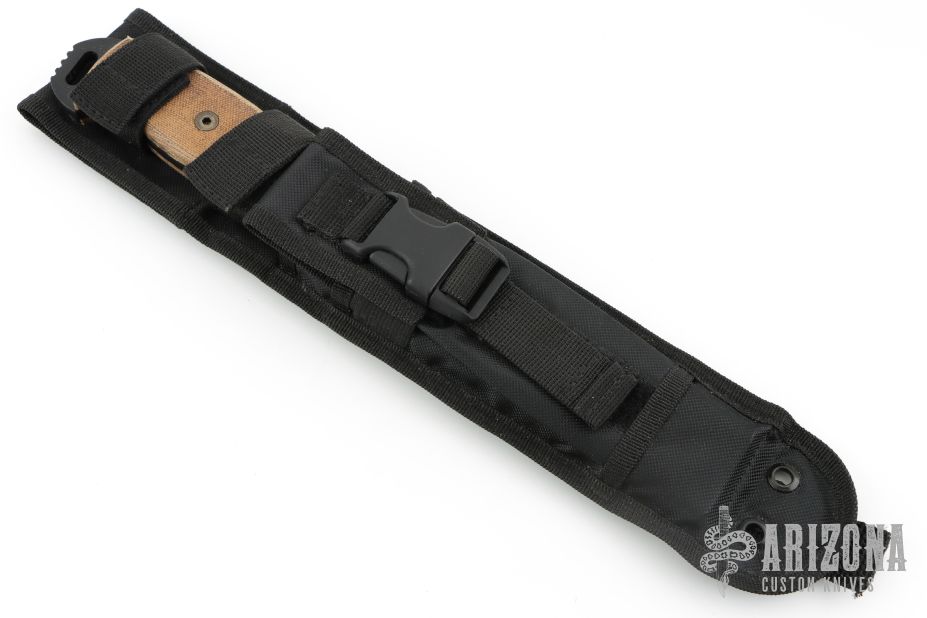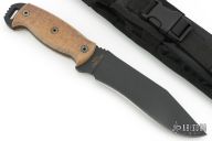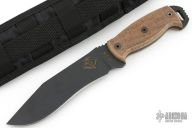 This knife by Ontario Knife Company features a black coated blade and brown canvas micarta scales. .260" blade thickness and 1.662" blade depth. Notched thumbrest. Full tang construction. Comes with black nylon sheath. Excellent condition.