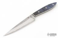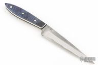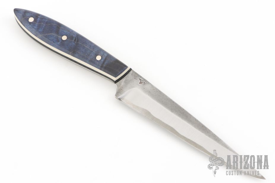 This Muteki Paring Knife by Carter Cutley was made by Aaron Linthicum, features a White Steel San Mai blade with .110" Blade Stock, .921" Blade Depth, full tapered tang construction. The handle has dyed and stabilized maple scales with white and black liners and nickel silver pins. Comes with original box and papers. Excellent condition.