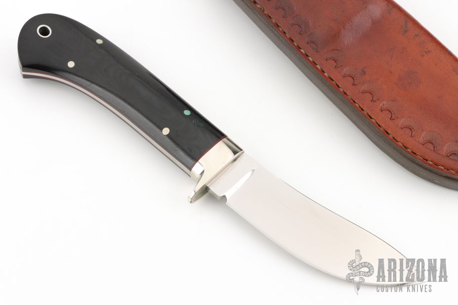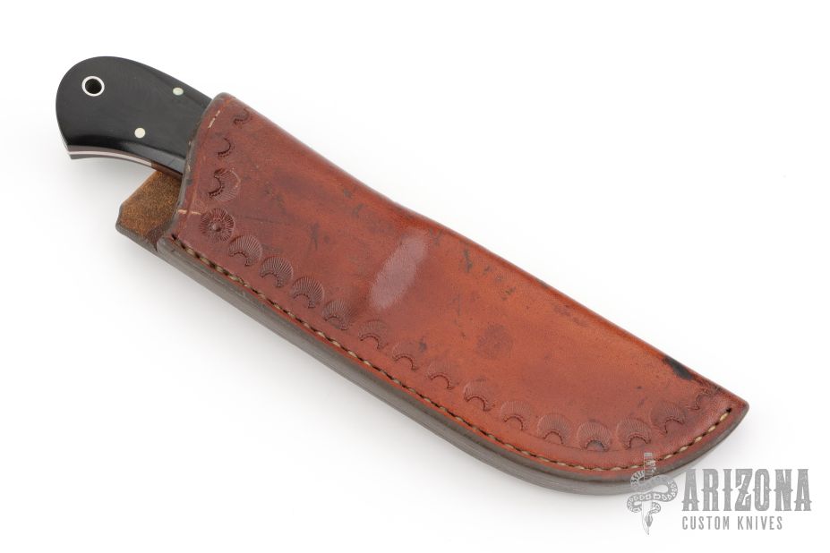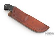 This Semi-Skinner by Jerry Langbein features a satin finished blade with a notched thumbrest, .155" blade stock and 1.073" blade depth, full tapered tang construction. The handle has a nickel silver guard, black linen micarta scales with red liners. Comes with a hand tooled brown leather sheath stamped 1983. Excellent condition.