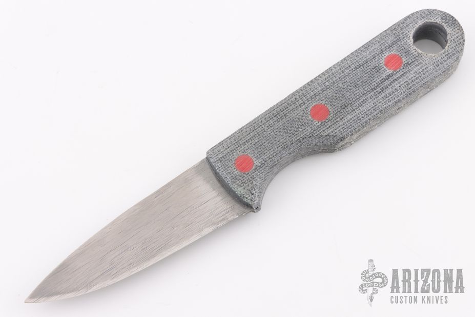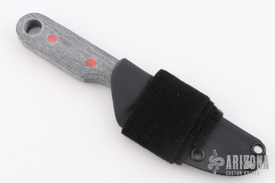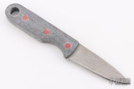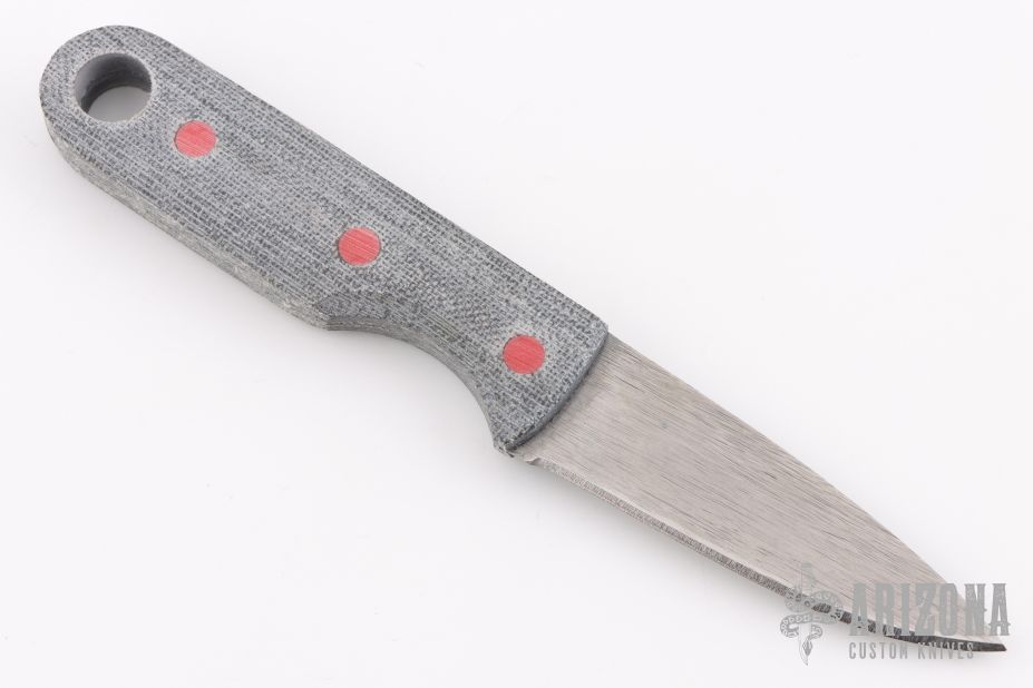This Knife by John Gray features a titanium blade with .030" blade stock and .998" blade depth, full tang construction. The handle has blue Terotuff micarta scales with red linen micarta pins and a large lanyard hole. Comes with a kydex sheath. Excellent condition.