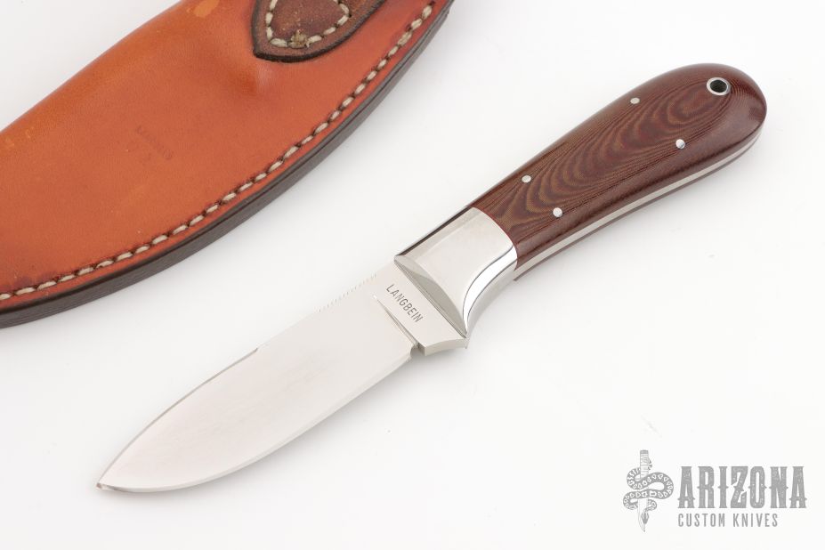 This Hunter by Jerry Langbein features a mirror finished blade with a notched thumbrest, .185" blade stock and 1.025" blade depth, full tapered tang construction. The handle has dovetailed stainless steel bolsters, brown linen micarta scales with red liners. Comes with a hand tooled brown leather sheath stamped '01. Excellent condition.