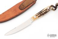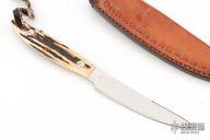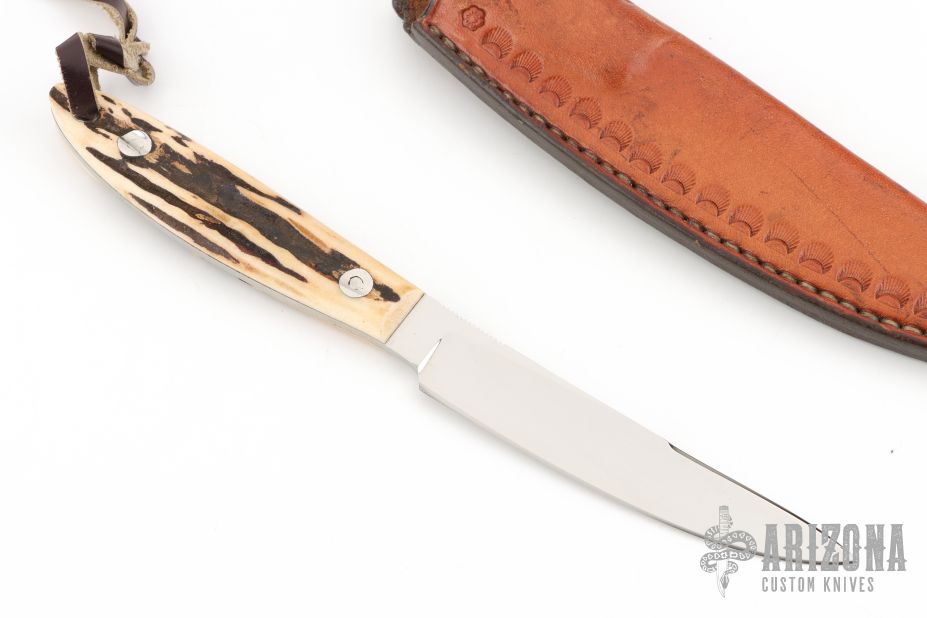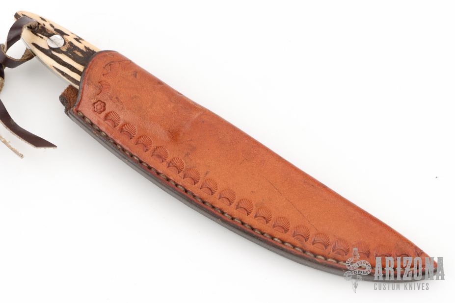 This Utility by Jerry Langbein features a mirror finished blade with false top edge and notched thumbrest, .125" blade stock and .814" blade depth, full tang construction. The handle has stag scales. Comes with a hand tooled brown leather sheath stamped 1988. Excellent condition.