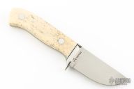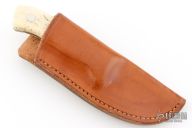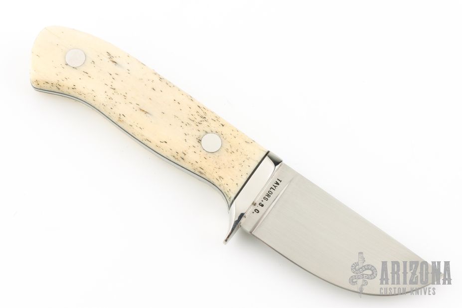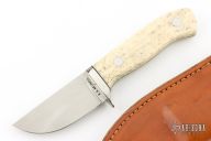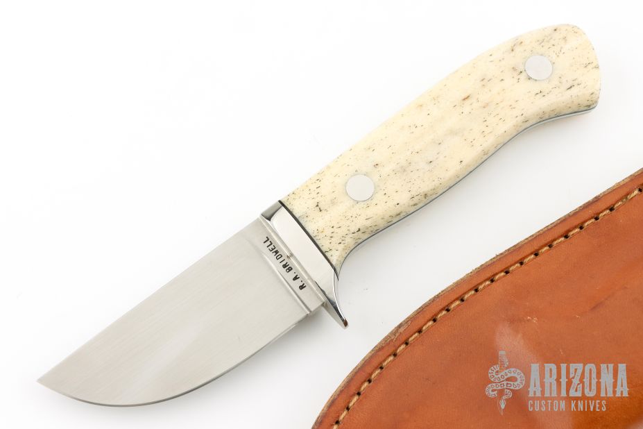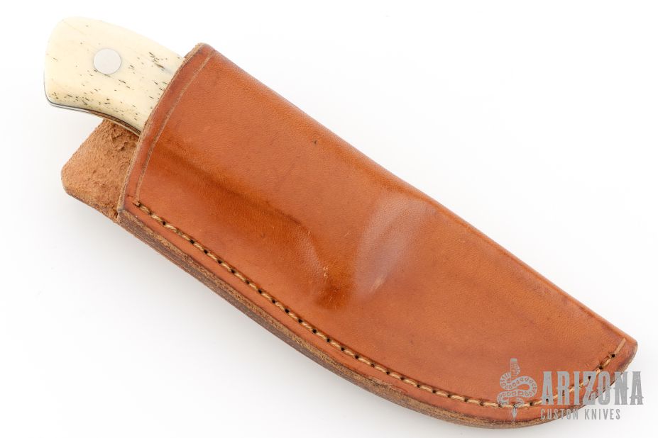 This Skinner by Richard Bridwell features a hand rub satin finished blade with .161" blade stock and 1.240" blade depth, full tapered tang construction. The handle has a nickel silver guard, bone scales and black liners. Comes with a brown leather sheath. Excellent condition.