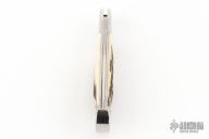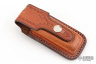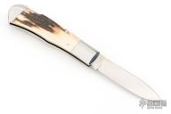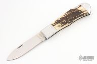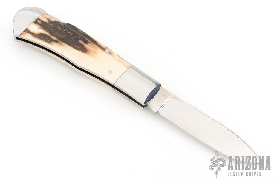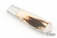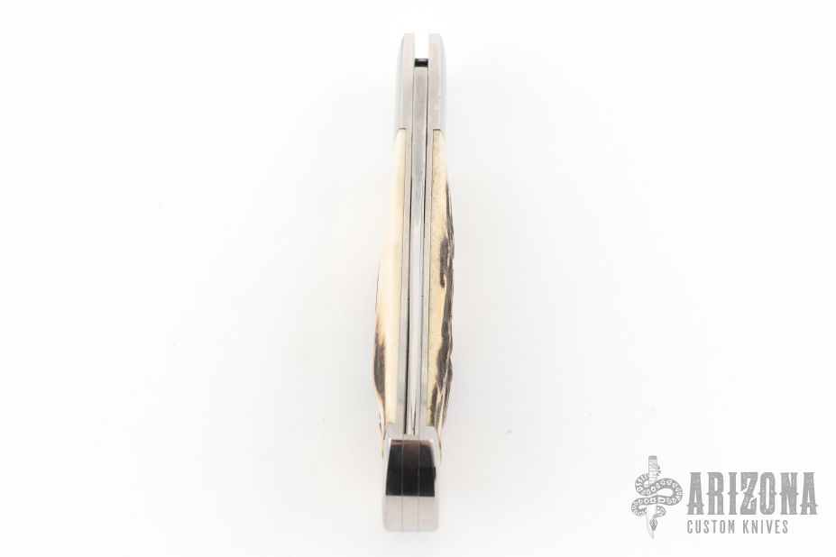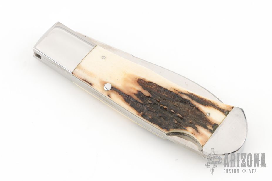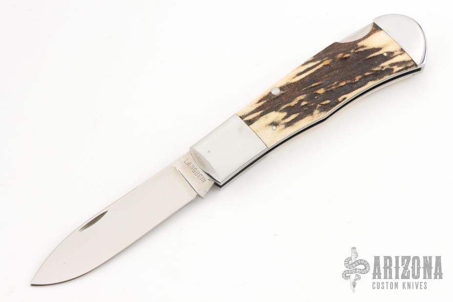 This lockback by Jerry Langbein features a mirror polished blade with nail nick. The handle has stainless steel double bolsters with integral liners, stag inlays, stainless steel spring. Excellent condition. Comes with a hand tooled brown leather sheath stamped 1989.