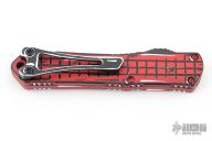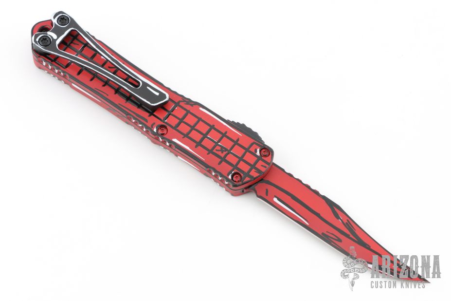 This Manticore-S by Heretic Knives features a red cell shading bowie blade. The handle has a red cell shading aluminum frame with a stainless steel tip down clip, checkered thumb slide. Comes with original box and papers. Excellent condition.