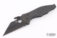 This Yojimbo 2 by Spyderco features a black finished wharncliffe blade with thumbhole, has an added wave feature opening thumbstud. The handle has Flytanium raindrop carbon fiber scales, black stainless steel liners, lock is on the spine of handle. Custom black stainless steel clip, left or right reversible, black titanium backspacer from EXO Tool. Nice detent, lockup and blade seating. Comes with a zippered case. Excellent condition.