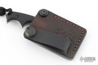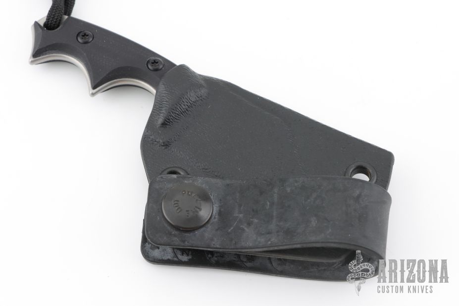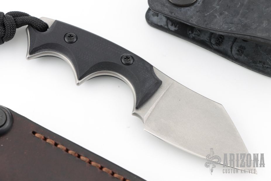 This BB Drago cutter V2 by Bastinelli Knives features a stonewashed sheepsfoot blade with notched thumbrest, .113" blade stock and 1.012" blade depth, full tang construction with black G-10 scales with lanyard hole. Comes with kydex sheath with IWB loop and original box. Comes with a custom brown leather sheath as well. Excellent condition.