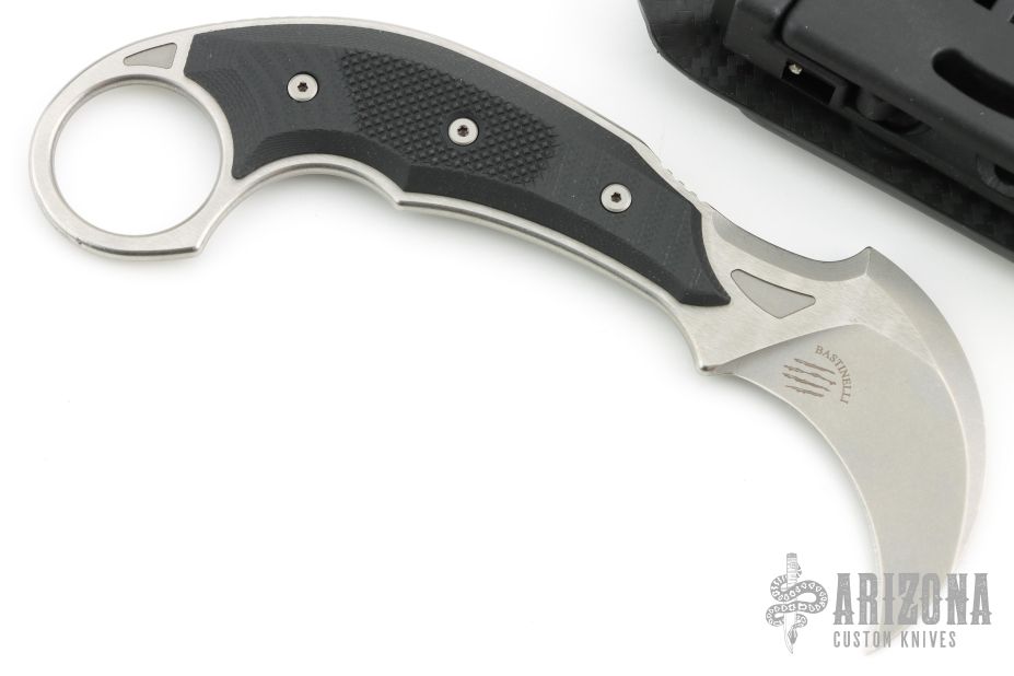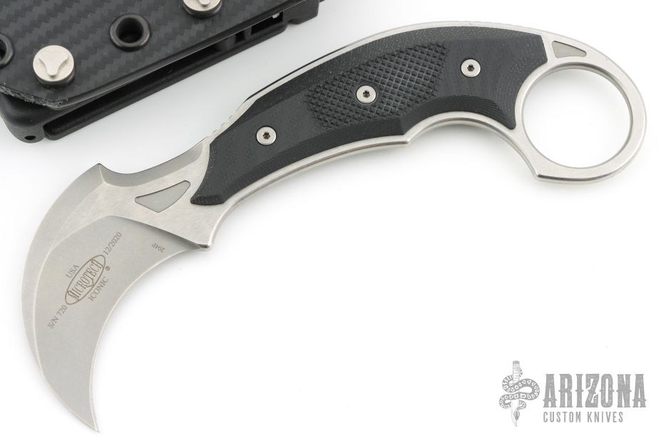 The Iconic is a collaboration between Microtech and Bastinelli. It is an incredible feat of design and manufacturing excellence that employs all of Microtech's knife prowess and Bastinelli's unique karambit style. Light in the hand and ergonomic, wielding the razor-sharp blade is a delight. Comes with a Microtech box (for a 118-10TRR which is the same knife but the trainer, this is not a trainer) and Kydex sheath with belt clip. S/N 720 and dated 12/2020. Excellent condition.