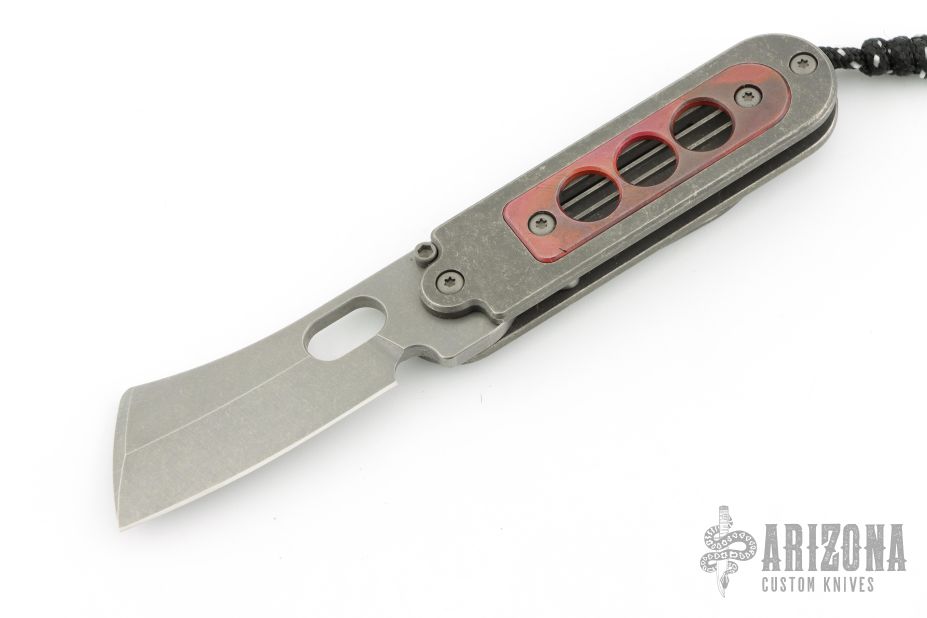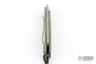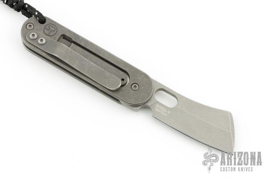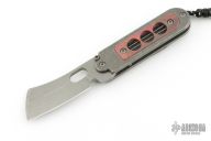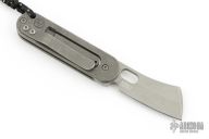 This Bean Cleaver folder by Serge Panchenko features a stonewashed cleaver style blade with front flipper/friction bar and thumb hole. The handle is stonewashed titanium with an antiqued copper inlay and a tip up clip. Has a detent to hold the blade in position open/closed, but it does not lock. Excellent condition. Comes with makers card.