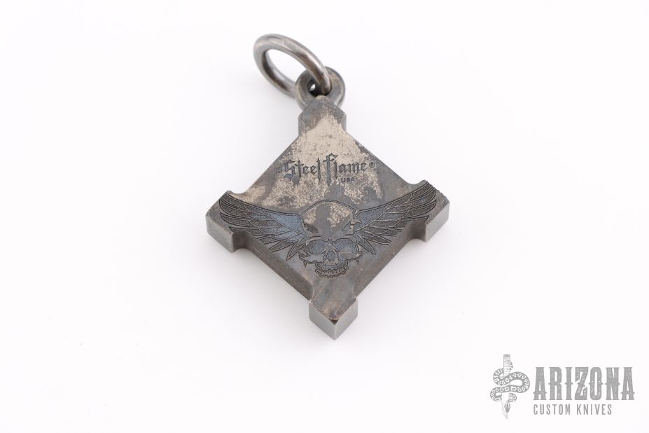 This copper Killbox by Steel Flame features a silver skull with ruby eyes inside the bullet hole. Winged Skull etched on the back. Excellent condition.