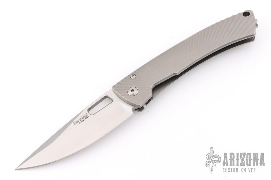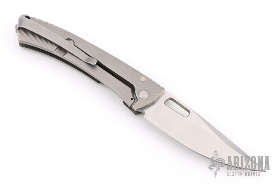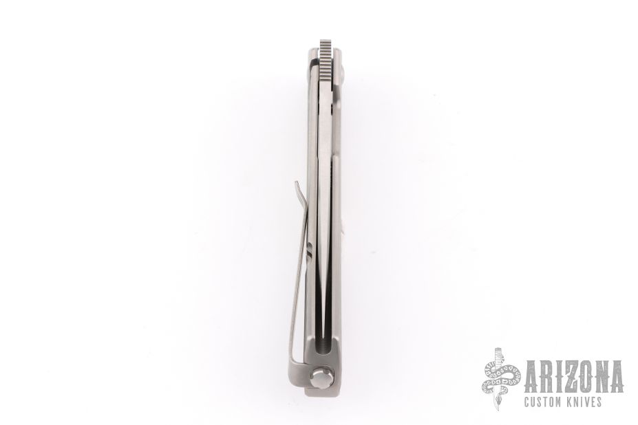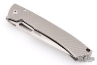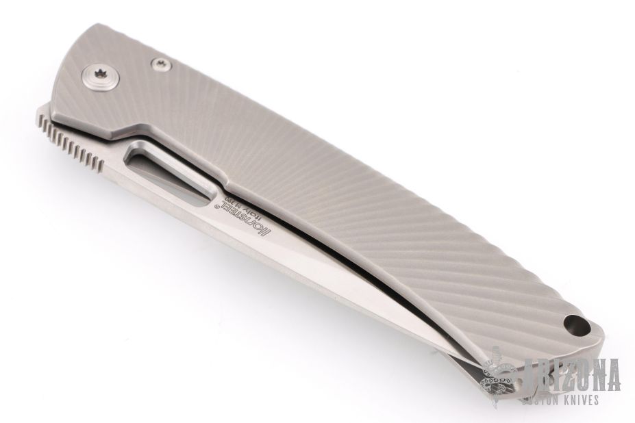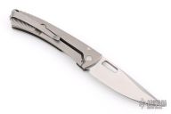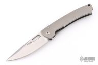 This TiSpine from Lion Steel features a satin finished spear point blade with square thumbhole and notched thumbrest. The handle has a blasted and milled integral titanium frame with tip up stainless steel clip. Nice detent, blade seating and lockup. Includes original tube and papers. Excellent condition.
