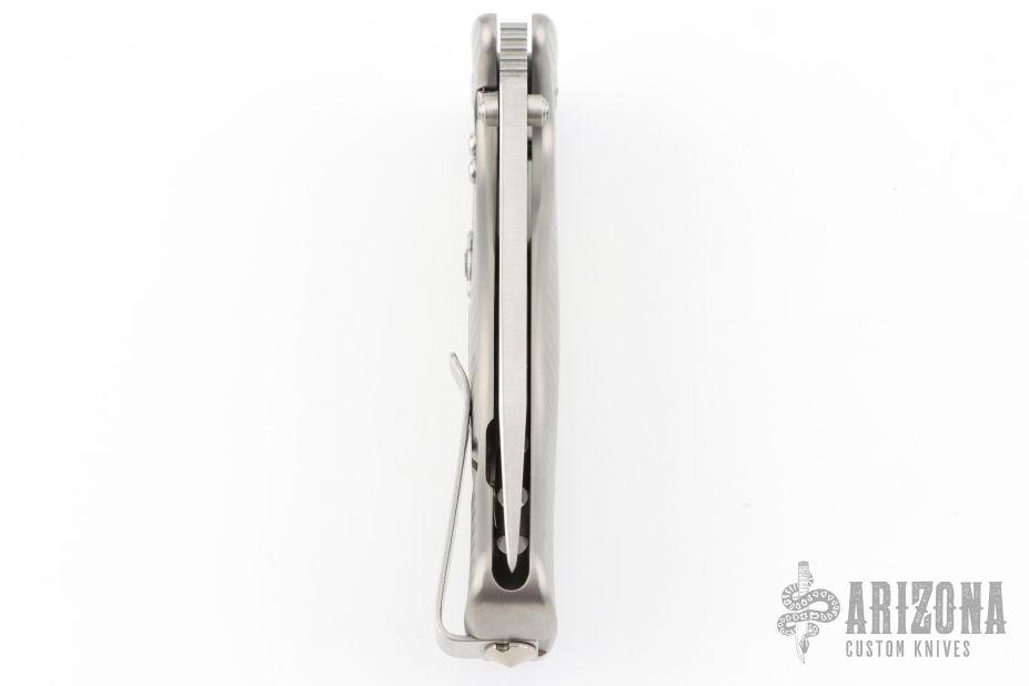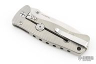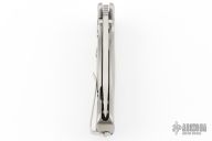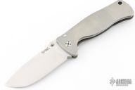 The SR-2 framelock folder by Lion Steel features a satin finish blade with notched thumbrest and dual thumbstuds. The handle is integral bead blasted titanium frame. Very sharp blade. Features rotoblock system which allows the blade to be locked open. Nice detent, blade seating and lockup. Excellent condition. Comes with original box, papers and tool.