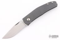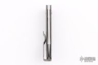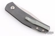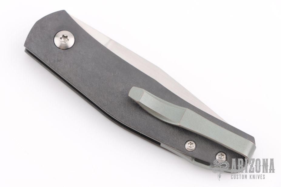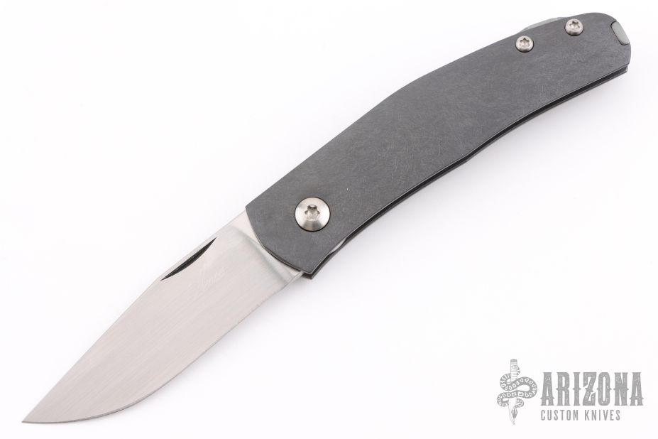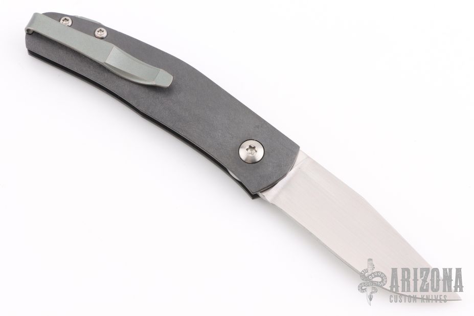 This Casino folder by Jens Anso features a hand rub satin finished blade with nail nick. The handle has a scratch finished zirconium frame, anodized and tumbled titanium tip up clip and backspacer with lanyard hole. Has a double detent mechanism to hold but not "lock" the blade in place. Has a half stop. Perfect blade seating. Excellent condition.