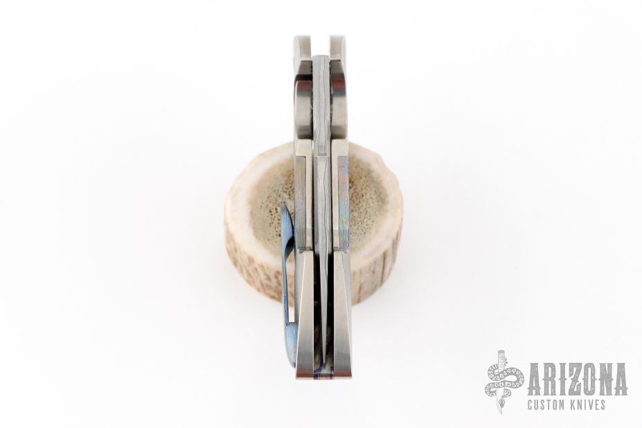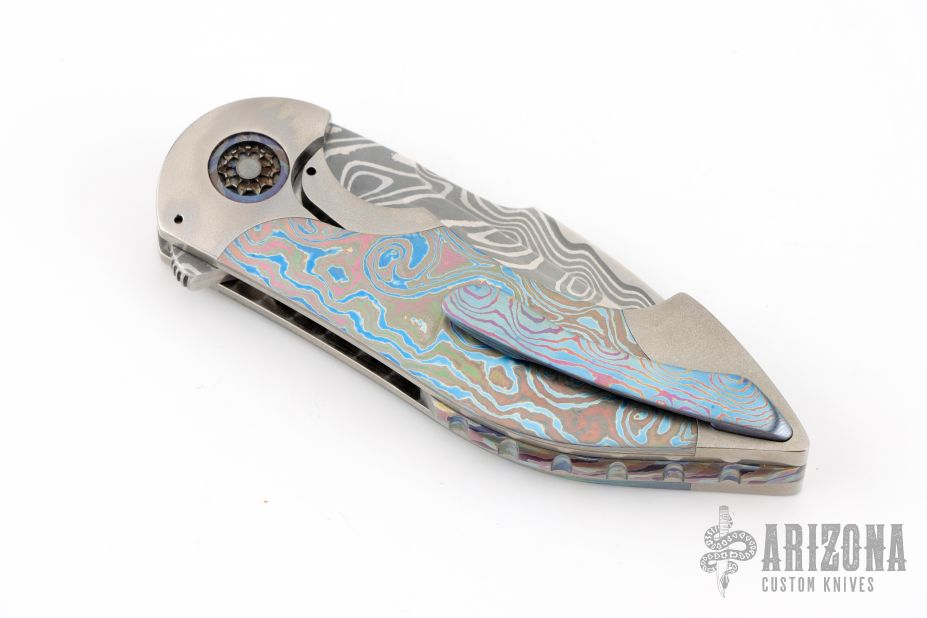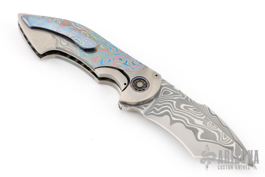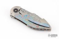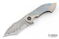 This One Off Fury Flipper by the Fischer Bros features a Damacore tanto recurve blade with a false top edge and a notched flipper. The handle has an orange peeled titanium frame with polished edges, timascus scales, timascus inlaid custom pivot, timascus tip up clip with hidden screws and a notched backspacer. Nice detent, lockup, action and blade seating, rides on bearings.  Excellent condition. Hard to come by!