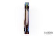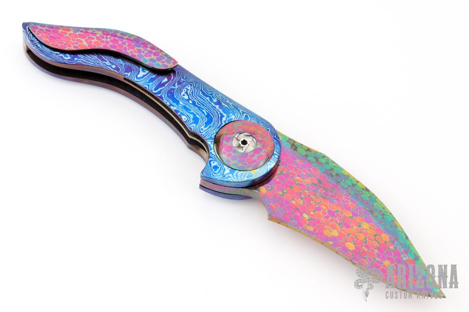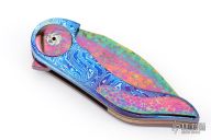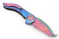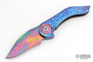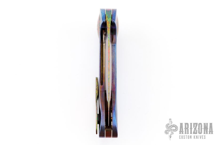 This Dressed Føniks Linerlock Flipper by Glenn Are Hovin features a Damascus blade with false top edge and flipper. The handle has a mokuti frame, custom milled pivot with bronzed Damascus pivot collars and matching tip-up pocket clip. This knife's only hardware visible is the pivot; Every other screw on the knife is hidden, pretty impressive and clean. Nice detent, lockup and blade seating. Excellent Condition.