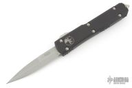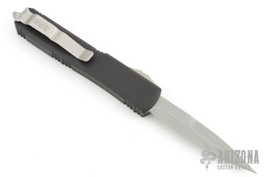 This Ultratech OTF automatic features a bayonet grind stonewash double edge blade with a standard edge and a blue anodized aluminum handle. Stainless steel clip. Glass breaker. Serial number 172254 and dated 07/2020. Comes with original box and papers. Excellent condition.