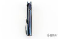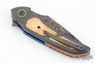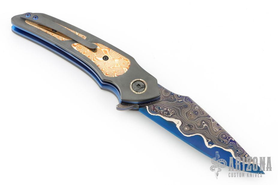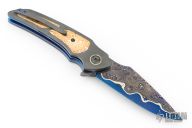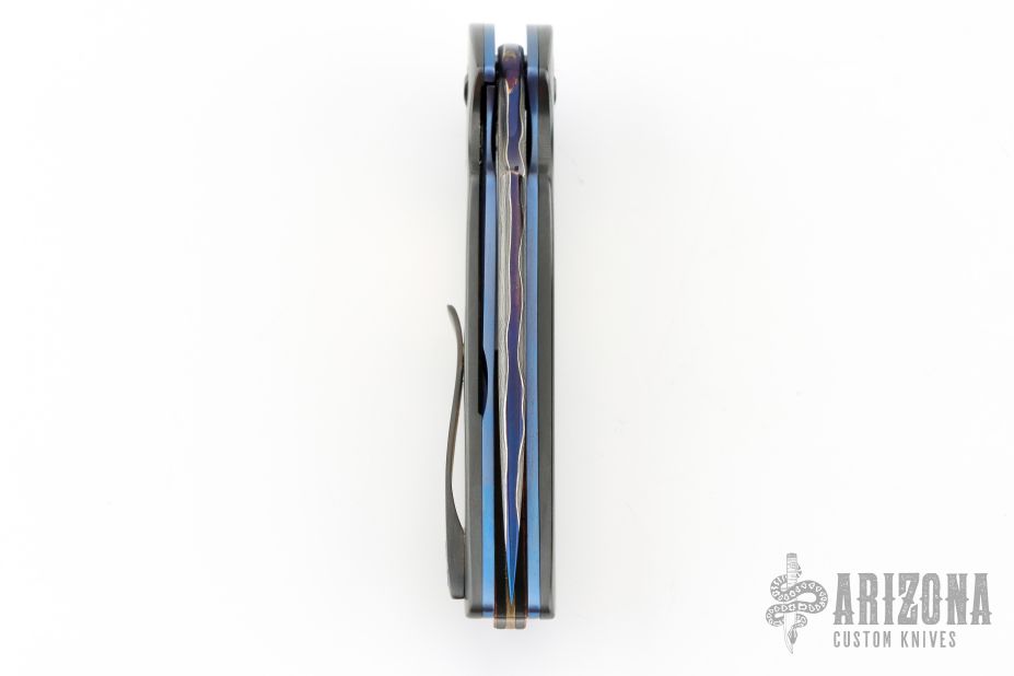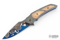 This full-dress VAMP flipper is a collaboration project between Peter Martin and Les Voorhies. This knife has a San-Mai Damascus blade.  The handle has zirconium scales with a matching tip-up pocket clip over anodized titanium liners.  The backspacer is made of copper, zirconium and mokume.  Excellent Condition.