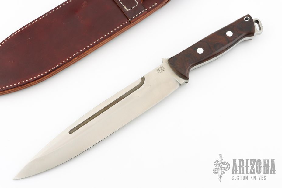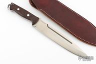 This Pig Sticker by Blackjack features a satin finished blade with fullers and a notched thumbrest, .251" blade stock and 1.550" blade depth, full tang construction with desert ironwood burl scales. Comes with a brown leather sheath. Excellent condition.
