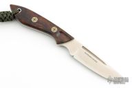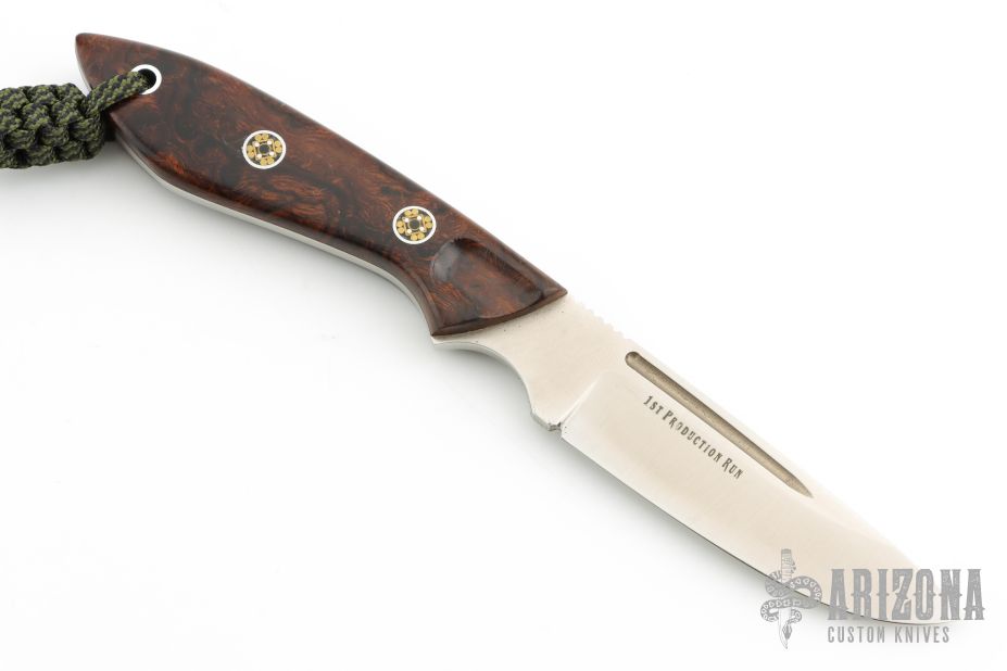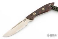This Adventurer from Bark River Knives features a satin finish blade with fuller and notched thumbrest, .135" blade stock and .900" blade depth, full tang construction. The handle has desert ironwood burl scales, mosaic pins with lanyard hole. Comes with a kydex sheath. Marked "First Production Run" on blade. Excellent condition.