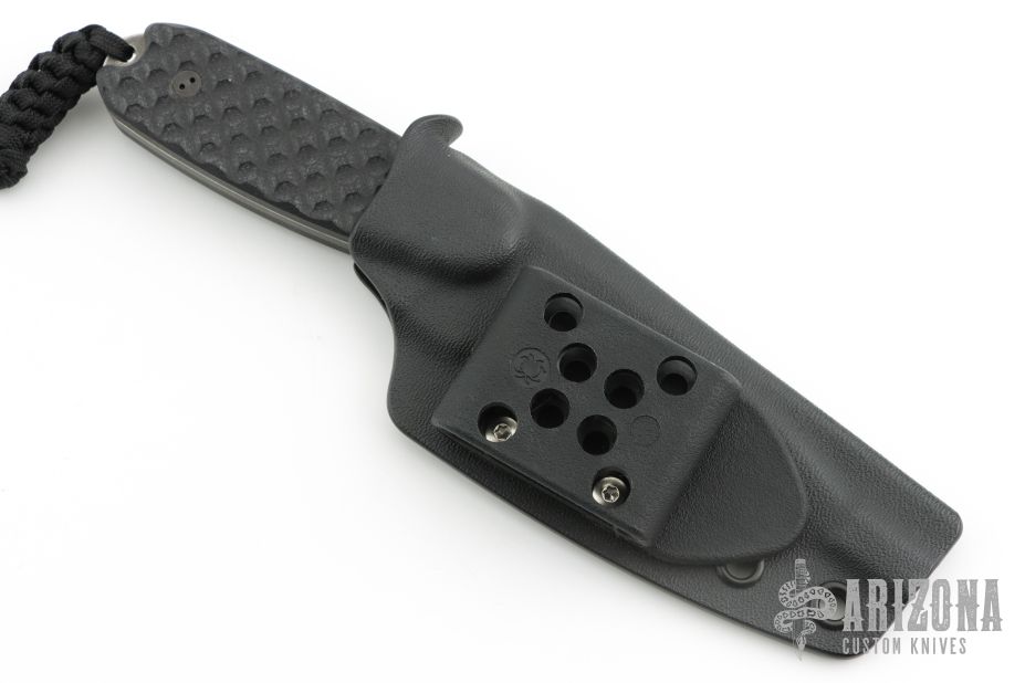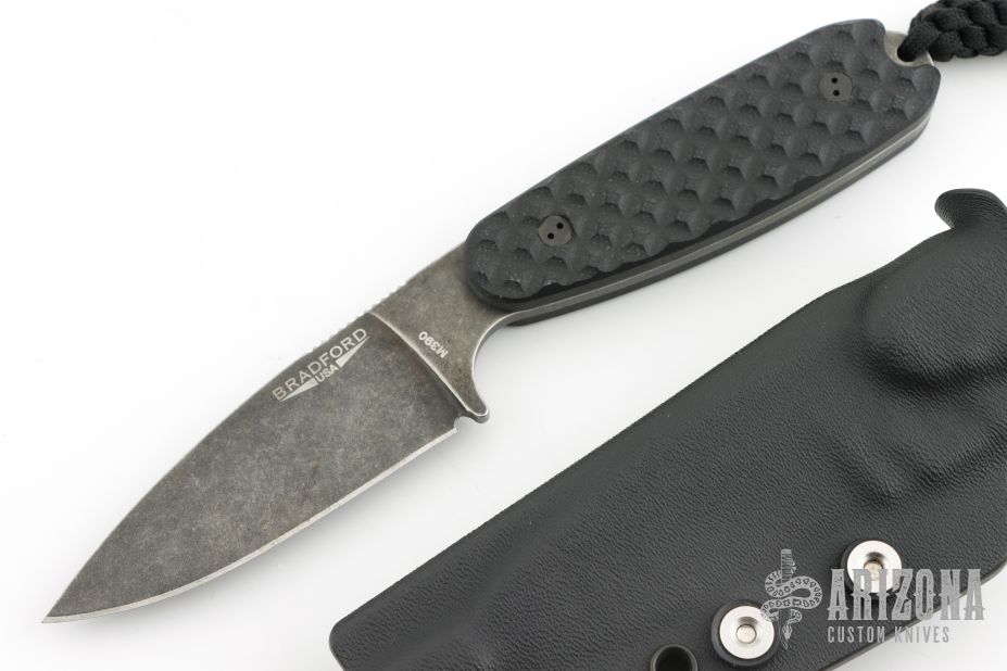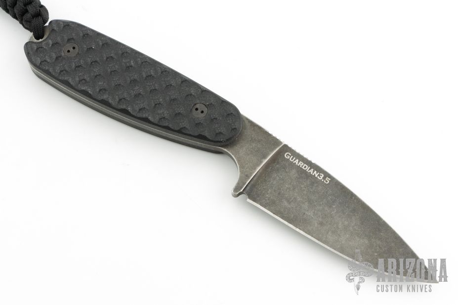 This Guardian 3.5 by Bradford Knives features a dark tumble finished drop point blade with notched thumbrest, .152" blade stock and 1.176" blade depth, full tang construction. The handle has a checkered black G-10 scales. Exposed tang pommel with lanyard hole. Includes a Kydex sheath. Excellent Condition.