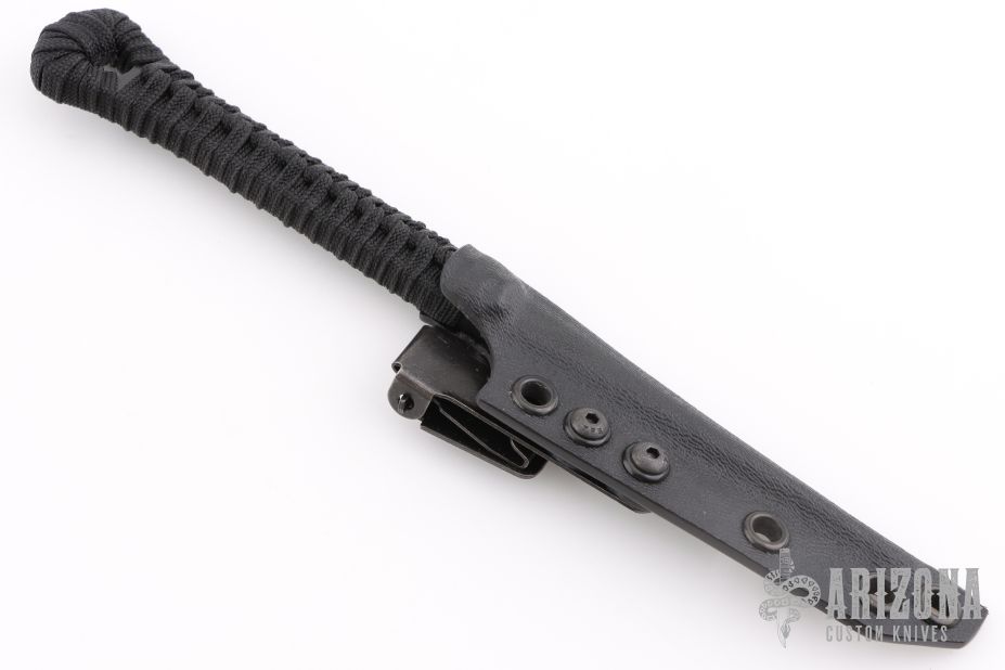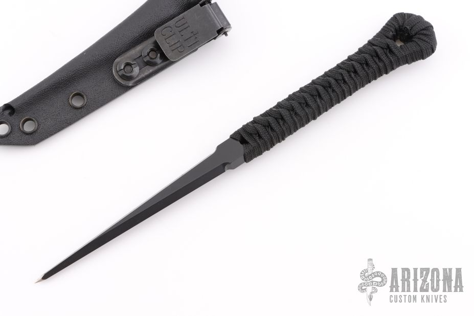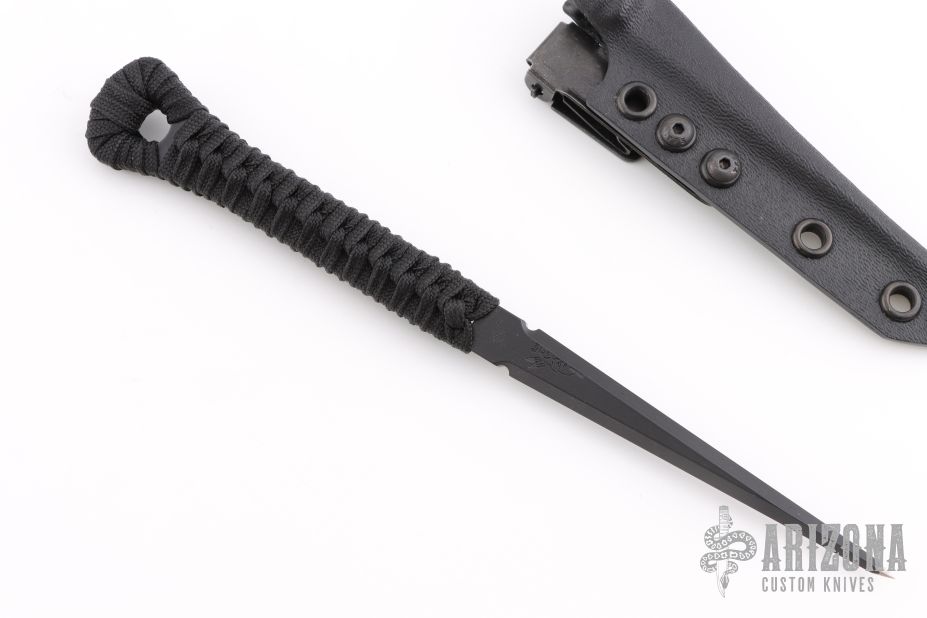 This Cardiac Spike by Half Face blades. They have cerakoted S35VN blades with paracord wrapped handle. Comes with kydex sheath with belt clip. Excellent condition.