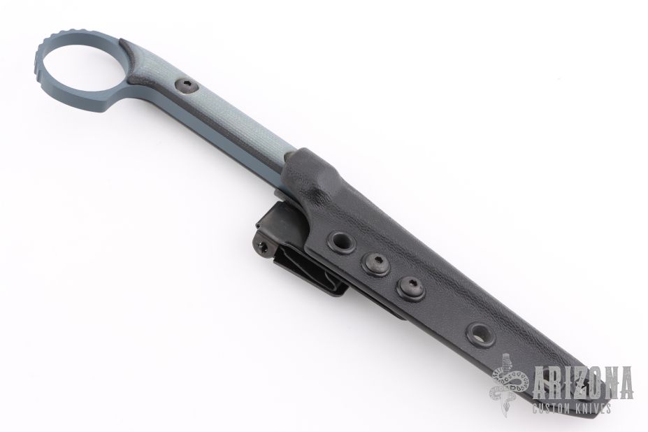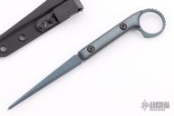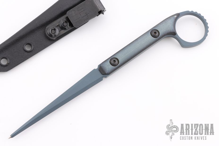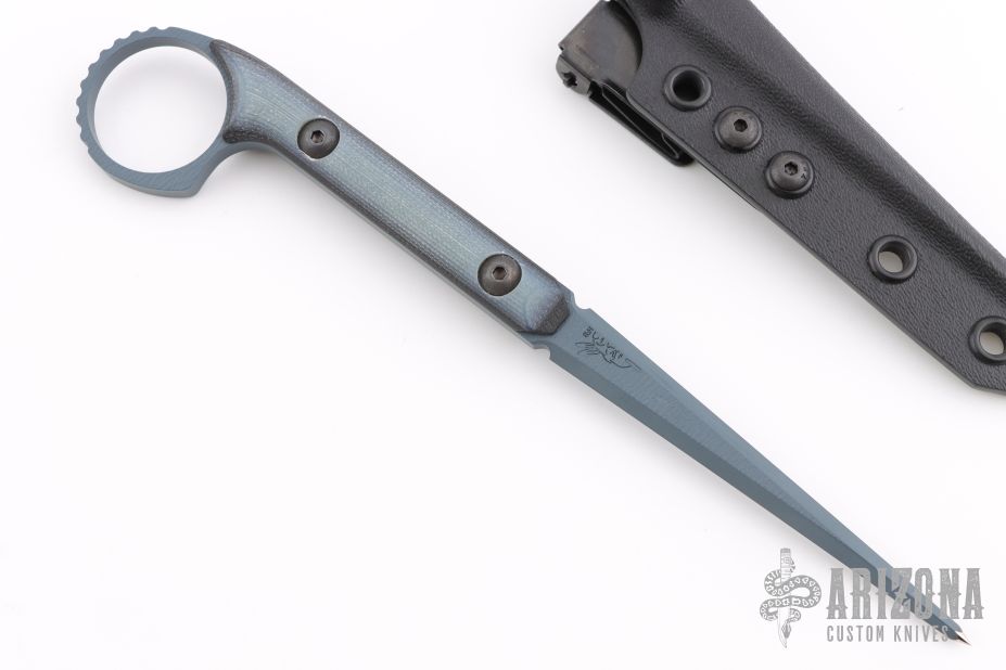 This Ringed Cardiac Spike by Half Face blades. Has a slate blue cerakoted blade with G-10 scales. Comes with kydex sheath with ulticlip. Excellent Condition.