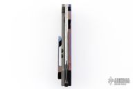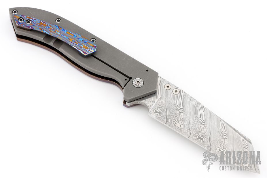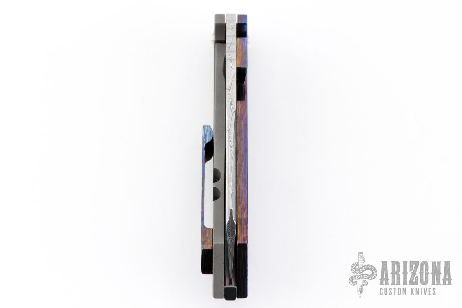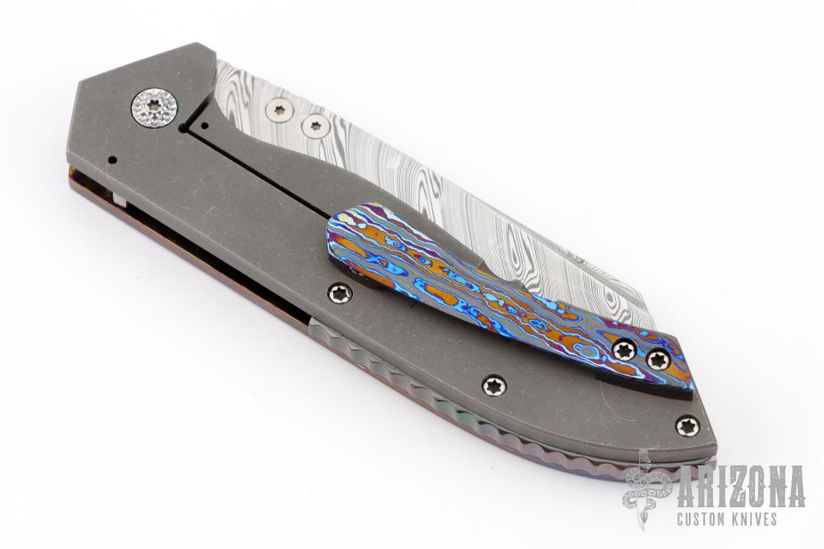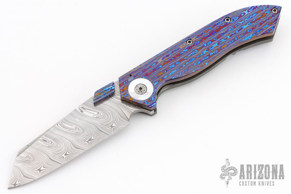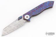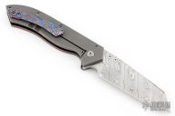 This Framelock Flipper by Turner Knife & Tool features a Damasteel blade with a single timascus thumbstud.  The handle has a black timascus show side and pocket clip and a tumbled titanium lockside.  Zirconium backspacer.  Mother-of-pearl pivot collar.  Excellent Condition.