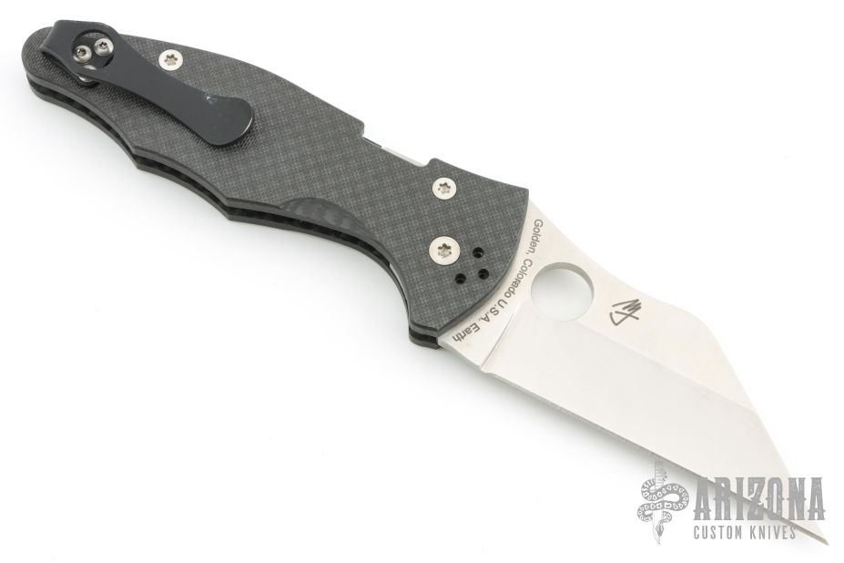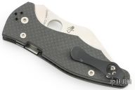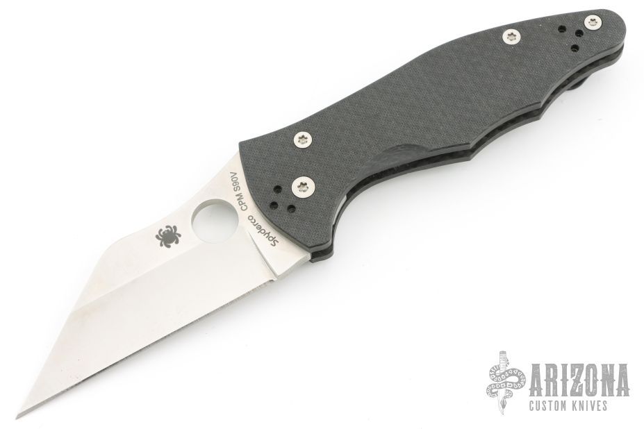 This Yojimbo 2 Linerlock Folder by Spyderco Knives has a satin finished CPM S90V wharncliffe blade with thumbhole. Handle is carbon fiber with single liner (top-side lock), and 4-way reversible black titanium clip. Has a scuff on the clip, otherwise excellent condition.