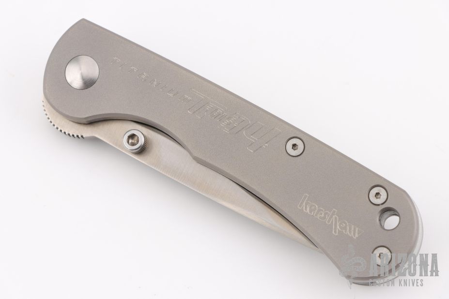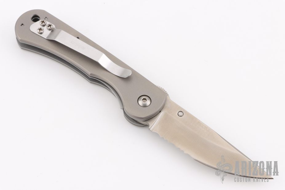 Kershaw 1410ST Oregon USA Titanium. This knife features a drop point satin finished partially serrated blade, bead blast finished titanium frame, steel liner, and bead blast finished tip up clip. Discontinued model. Has a couple light scuffs, excellent condition otherwise.