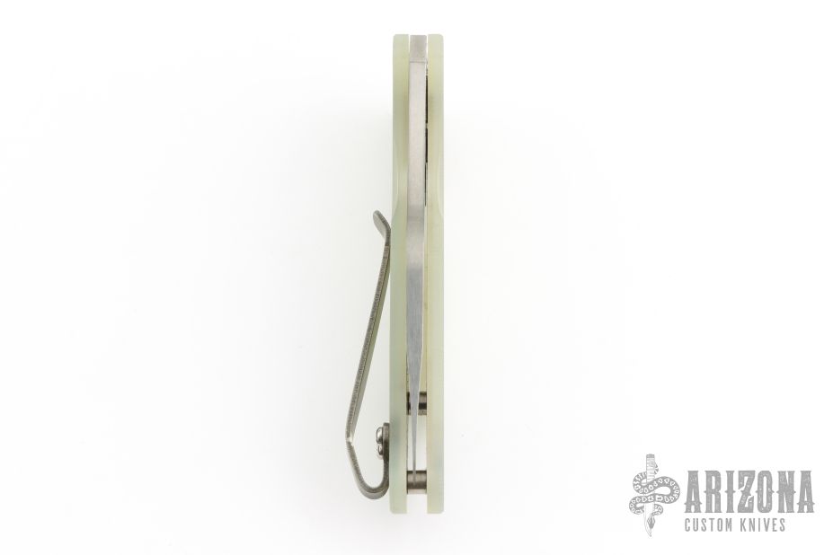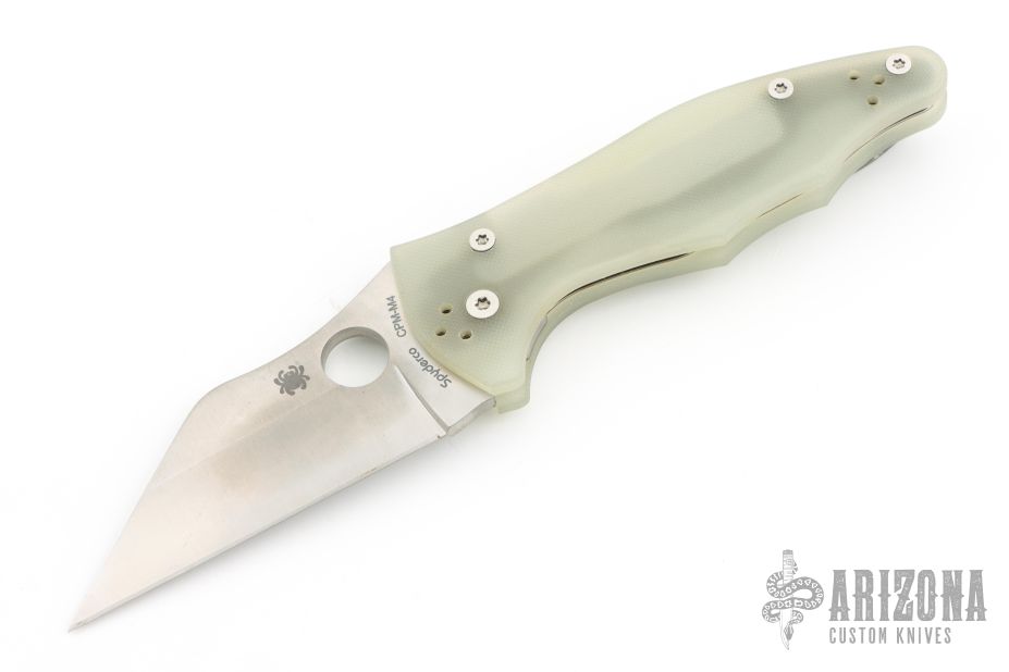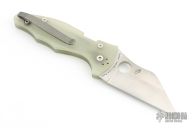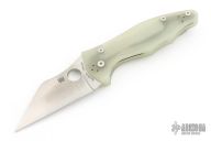 This Yojimbo 2 by Spyderco features a satin finished wharncliffe blade with thumbhole. The handle has a jade G-10 frame with stainless steel liners, lock is on the spine of handle. 4-way reversible stonewashed titanium deep carry clip. Nice detent, lockup and blade seating. Excellent condition.