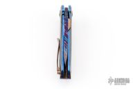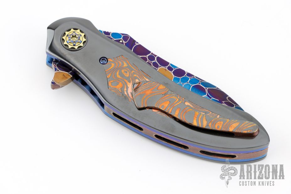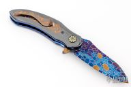 This QSB by Peter Martin features a Damascus blades with a single mokume thumbstud and a fileworked thumbrest.  The handle has zirconium scales with mokume inlays, zirconium pivot collars, mokume backspacer and tip up mokume pocket clip with hidden screws.  Nice Detent, lockup and blade seating. Excellent Condition.
