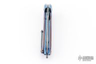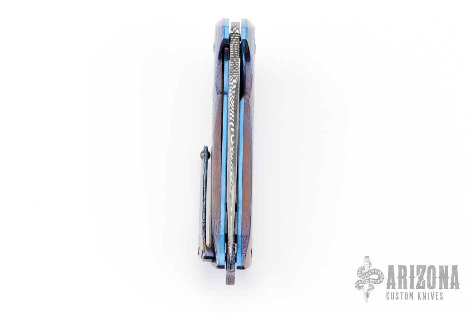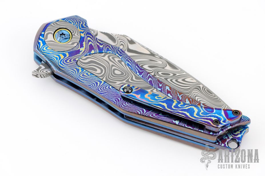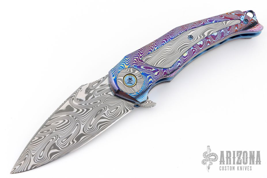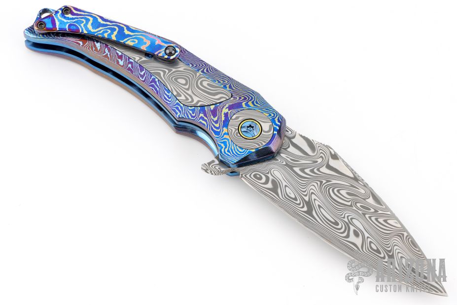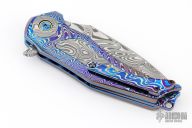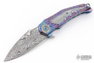 This Voyager by Peter Martin is a Faisal Yamin design, it features a Damasteel blade with a flipper. The handle mokuti scales, Damasteel pivot collars and inlays.  Mokuti tip up pocket clip.  Anodized titanium liners.  Nice detent, lock up and blade seating.  Excellent Condition.